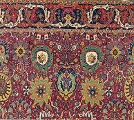 Wann und wie genau die Perser begonnen haben, Teppiche zu knüpfen, ist noch unbekannt, aber das Wissen um ihre Herstellung und die Kenntnis geeigneter Designs für textile Bodenbedeckungen war in dem Byzanz, Anatolien und Persien umfassenden Gebiet sicher schon länger bekannt. Anatolien, zwischen Byzanz und Persien gelegen, war schon seit 133 v. Chr. unter römischer Herrschaft. Geographisch und politisch, in wechselnden Bündnissen als auch durch Handel, verband Anatolien das Byzantinische mit dem Perserreich. Auf künstlerischem Gebiet entwickelten beide Reiche ähnliche Stile und dekoratives Vokabular, wie aus Mosaiken und der Architektur des römerzeitlichen Antiochia deutlich wird.[5] Ein türkisches Teppichmuster, abgebildet auf Jan van Eycks Gemälde Jungfrau mit Kind des Kanonikus van der Paele konnte auf spätrömische Ursprünge zurückgeführt und in Verbindung gebracht werden mit umayyadischen Bodenmosaiken aus Khirbat al-Mafdschar.[6] Die Architektur-Elemente im Baukomplex von Khirbat al-Mafdschar werden als beispielhaft für die Aneignung und Weiterentwicklung präislamischer Muster in der frühen islamischen Kunst angesehen (Broug, 2013, S. 7[7]).